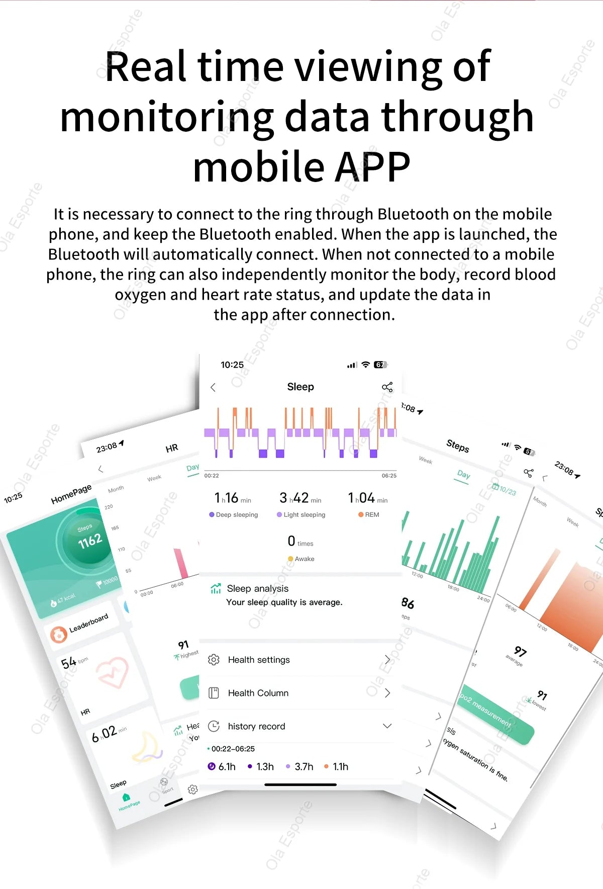 Connects via Bluetooth 5.0 to the Qring app for real-time tracking of heart rate, activity, multi-sport performance, sleep, and more. Some similar devices also support blood oxygen (SpO₂), stress levels, and even gesture controls, though confirmation for your model may vary
